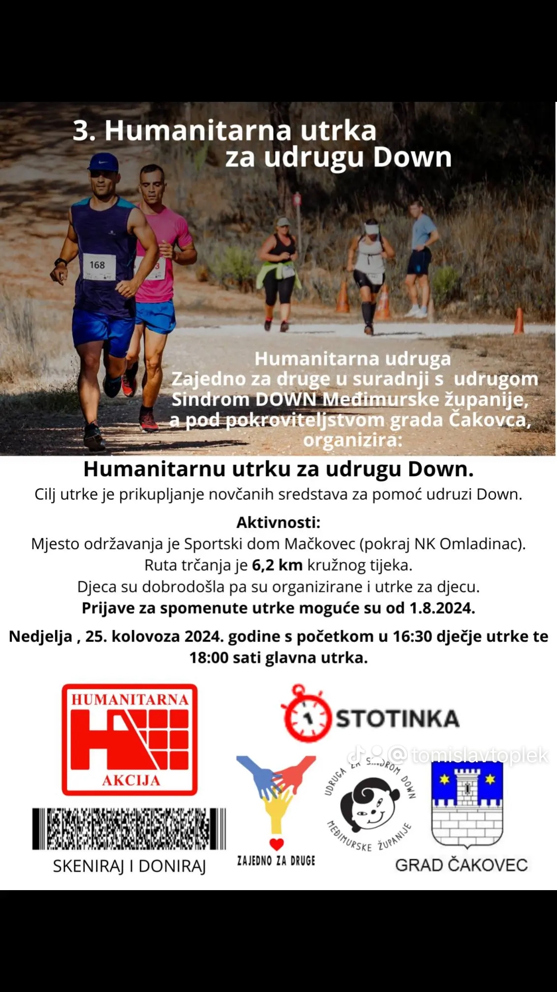 Humanitarna udruga Zajedno za druge u suradnji s udrugom Sindrom Down Međimurske županije organizira 25. kolovoza Humanitarnu utrku za udrugu Down. Mjesto održavanja je Sportski dom Mačkovec.