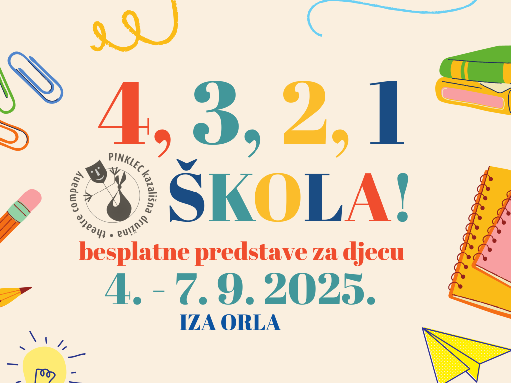 Čakovec će i ove godine početak školske godine obilježiti smijehom i predstavama za najmlađe. Od 3. do 7. rujna Kazališna družina Pinklec donosi program “4,3,2,1 škola!” uz besplatan ulaz na sve izvedbe u Centru za kulturu i na IZA ORLA (u slučaju kiše).