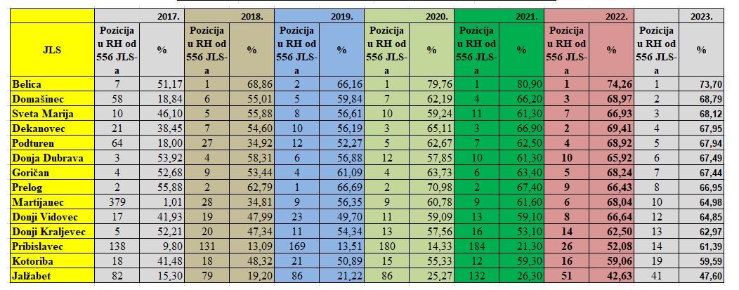 No, dok je Domašinec 2017. godine bio na 58. mjestu, Sveta Marija je bila na 10. mjestu u Hrvatskoj a od 2020. njezina pozicija se poboljšavala da bi sada ta općina, prvi put, završila na visokom 3. mjestu. U svakom slučaju, ovi rezultati su vrlo pohvalni za stanovnike općina Belica, Domašinec i Sveta Marija!