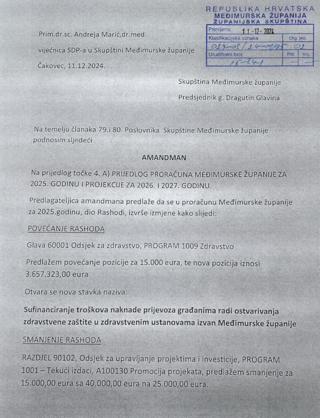 Dr. Andrea Marić, liječnica Županijske bolnice Čakovec i vijećnica u Skupštini Međimurske županije, na 20. sjednici Županijske skupštine Međimurske županije podnijela je amandman, koji je prihvaćen, a odnosi se na pokrivanje troškova prijevoza pacijenata umirovljenika i starijih od 65 godina u zdravstvene ustanove izvan Međimurja.