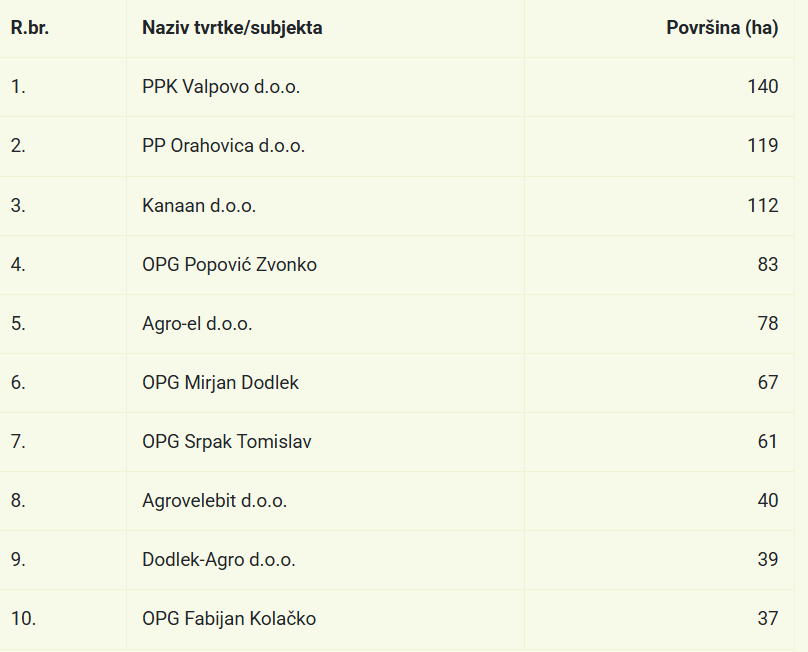 Deset najvećih proizvođača ove popularne povrćarske kulture uzgaja ju na 779 hektara te tako drže preko 14 posto proizvodnje u sustavu potpora. Prva četiri proizvođača dolaze iz Slavonije, dok ostali s popisa (osim Agrovelebita d.o.o. koji je iz Like) dolaze iz sjeverne Hrvatske.