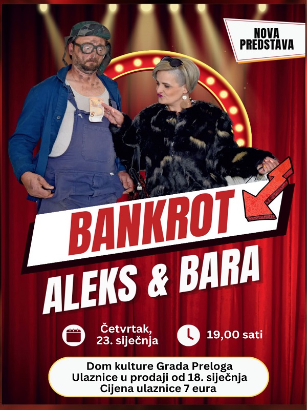 U Dom kulture Grada Preloga vraćaju se Aleks i Bara. Popularni ljubavni par Prelog je već posjetio na prošlogodišnjim Danima smijeha, a zbog velikog interesa vraćaju se na daske Doma kulture u četvrtak 23. siječnja, s početkom u 19 sati. “Bankrot” je predstava puna preokreta i iznenađenja u kojoj se pronalaze i dame i gospoda i šljakeri i domaćice.