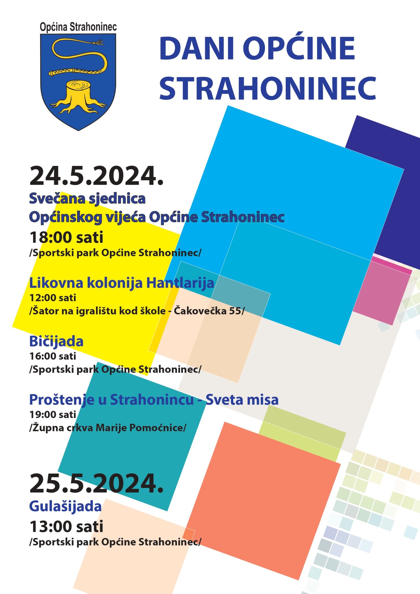 Tako će se svečana sjednica Općinskog vijeća Strahoninec održati u petak, 24. svibnja, s početkom u 18 sati u Sportskom parku kod nogometnog igrališta. Prije toga, već u 12 sati, pod šatorom kod Osnovne škole, počinje Likovna kolonija Hantlarija, a u 16 sati Bičijada u Sportskom parku.