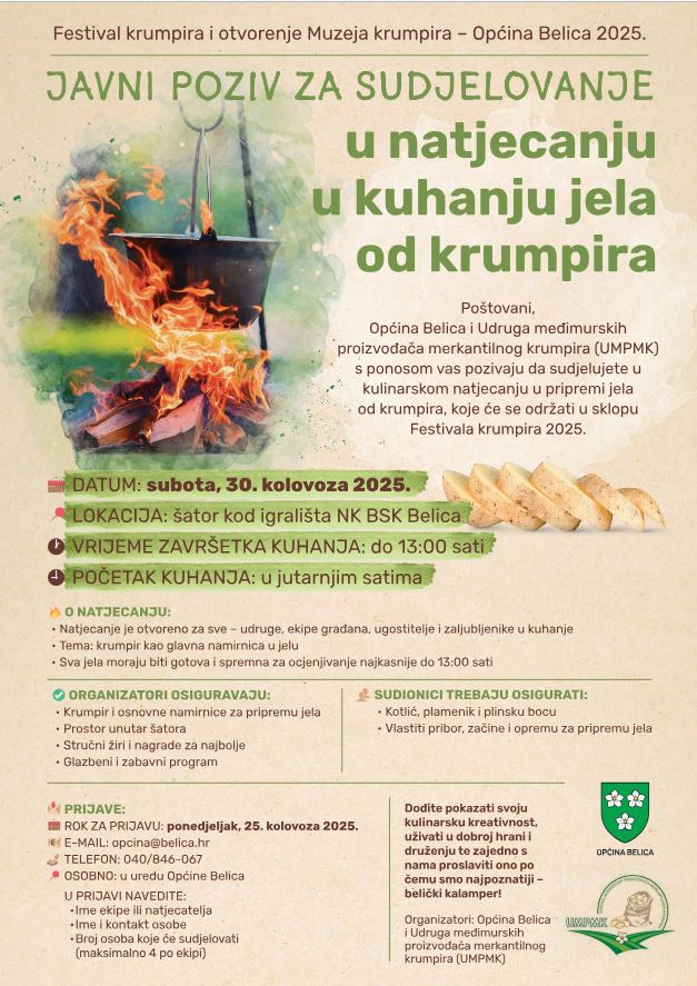 Cjelodnevni program obogatit će napuhanac za djecu, grah, roštilj, langoši i mnoštvo zabave, pa organizatori, Općina Belica i Udruga međimurskih proizvođača merkantilnog krumpira, pozivaju sve da se pridruže ovom važnom događaju.