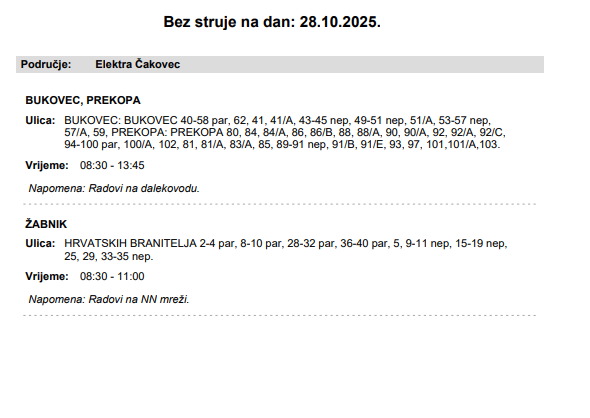 Iz HEP-a javljaju kako Bukovec, Prekopa i Žabnik neće imati električne energije sutra, 28. listopada.