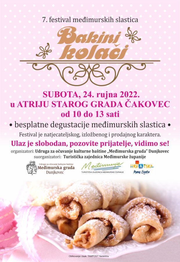 Udruga za očuvanje kulturne baštine „Međimurska gruda“ iz Dunjkovca organizira 7. festival međimurskih slastica pod nazivom “Bakini kolači” koji se održava u subotu, 24. rujna 2022. u atriju Starog grada u Čakovcu od 10 do 13 sati.