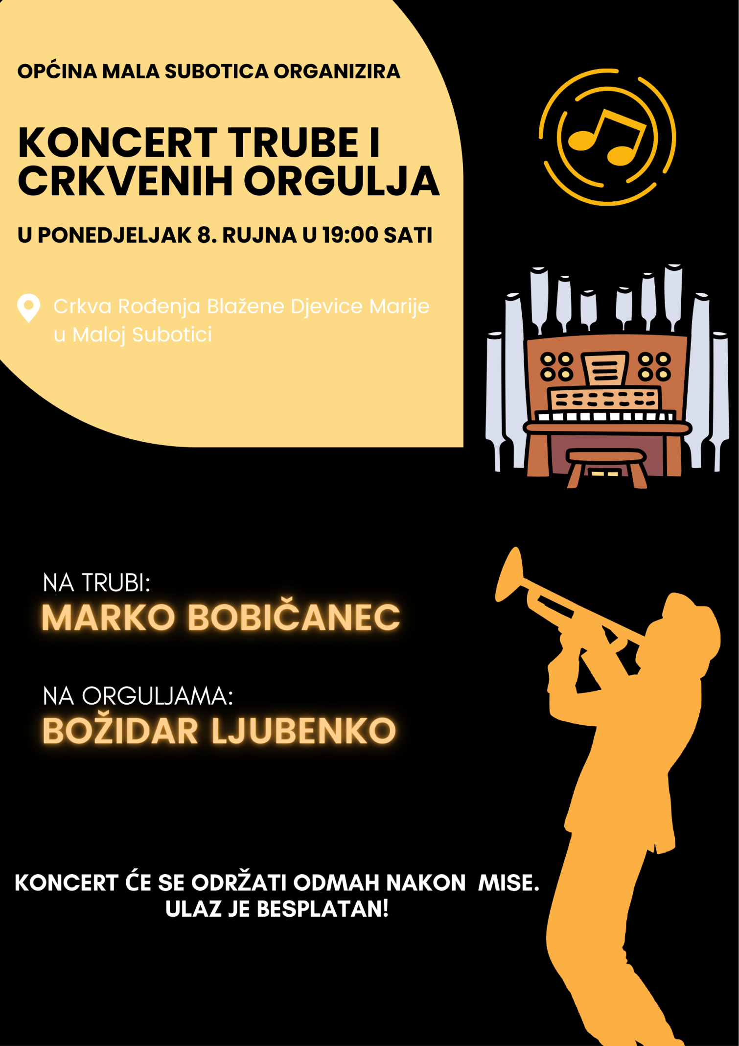 U ponedjeljak, 8. rujna, u Crkvi Rođenja Blažene Djevice Marije u Maloj Subotici održat će se koncert pod nazivom Duo truba i orgulje, a početak je zakazan nakon mise u 19 sati. Glazbeni dvojac, Marko Bobičanec na trubi i Božidar Ljubenko na orguljama, priredit će program koji će ispuniti crkvene svodove bogatim zvukovima i donijeti publici nesvakidašnje iskustvo.
