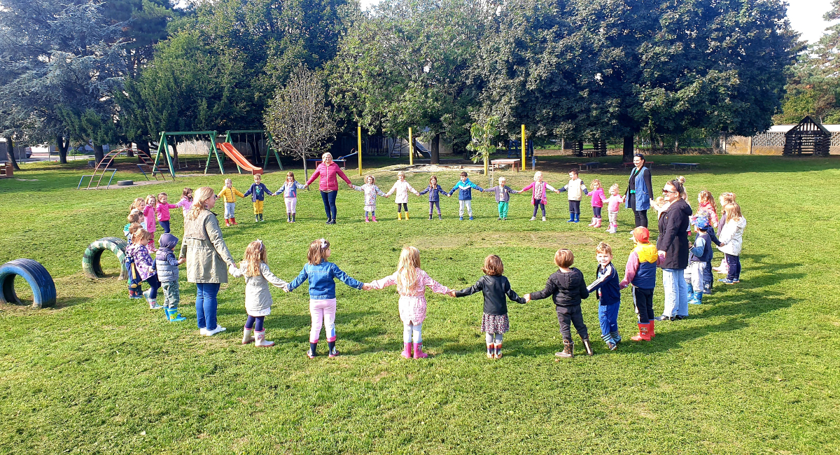 Na vrtićkom igralištu su u znak podrške i promicanju Dana mira napravila krug mira držeći se za ruke pitali smo ih, čemu služe ruke?