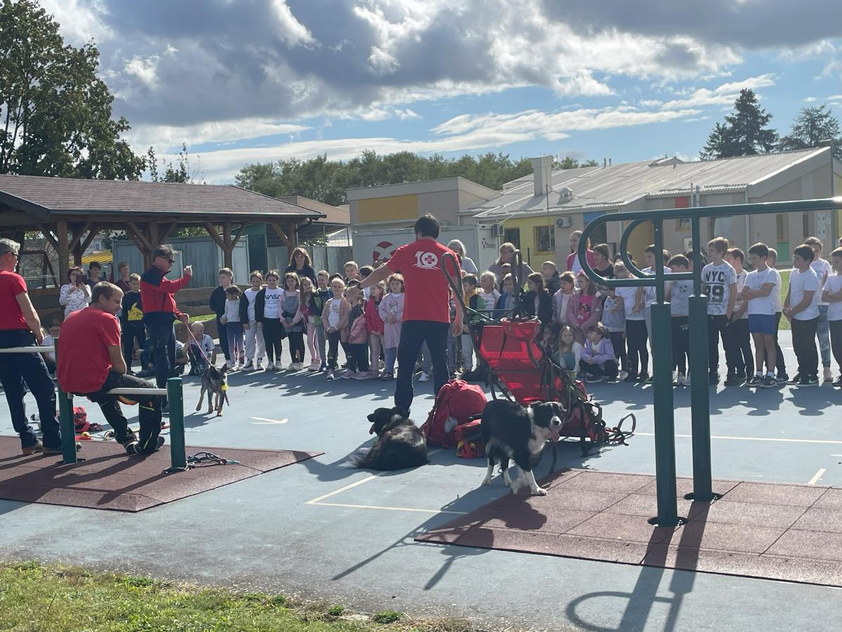 Članovi HGSS-a, zajedno s potražnim psima Mazom, Grijem i Whisperom, održali su prezentaciju za učenike od 1. do 4. razreda, naglašavajući važnost životinja u spašavanju ljudskih života.