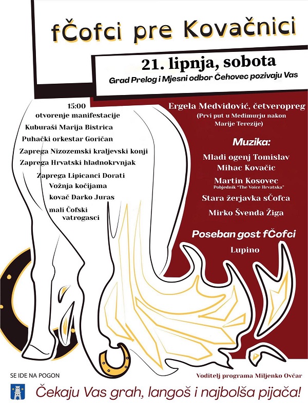 Niz događanja u Prelogu nastavlja se ove subote, četvrtim izdanjem tradicionalne manifestacije „fČofci pre Kovačnici“. Otvorenje je predviđeno kod prostora Kovačnice Mihac, u subotu 21. lipnja, s početkom u 15 sati. Ovo je tradicijsko glazbena manifestacija koja nastoji očuvati vrijednosti zanatstva, tradicijskog načina života njegovanje marljivosti, druženja, podupiranja vlastite zajednice kroz obdržavanje zajedništva.