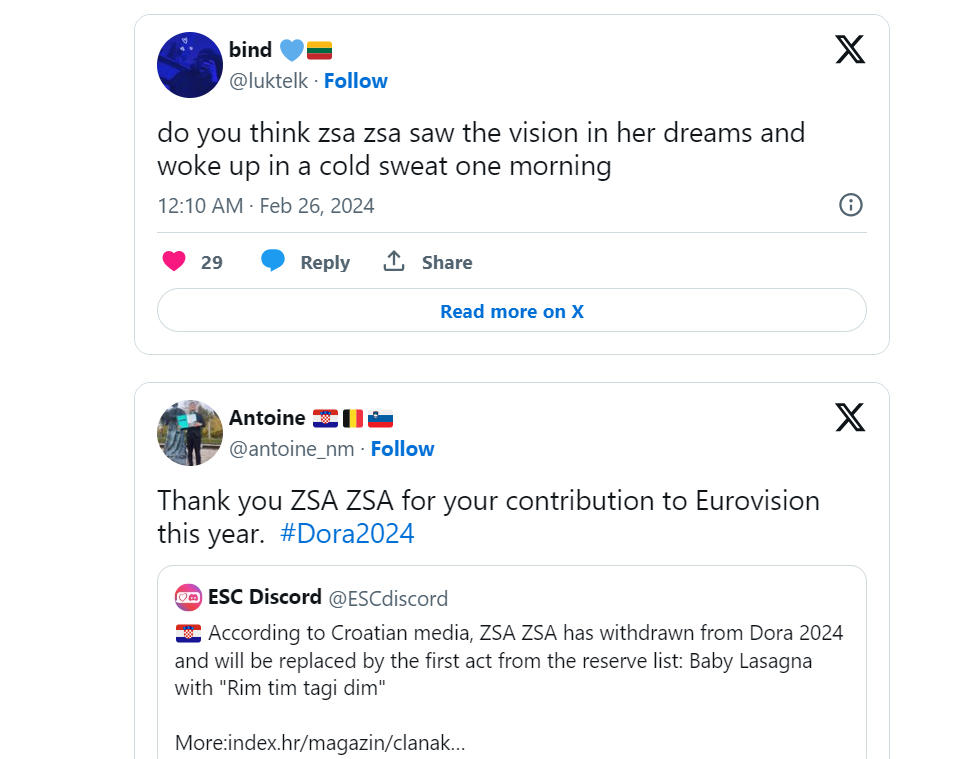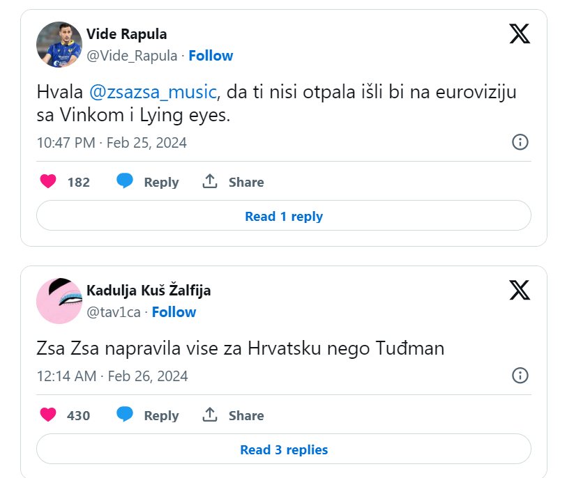 “Hvala, Zsa Zsa, da ti nisi otpala, išli bi na Euroviziju s Vinkom i Lying Eyes”, “Zsa Zsa napravila više za Hrvatsku nego Tuđman”, “Nacionalni heroj”, “Zamislite svijet u kojem Zsa Zsa nije odustala od Dore”, “Ne nose svi heroji plašteve”, “Ustat pa reć: hvala, Zsa Zsa”, pišu tviteraši.
