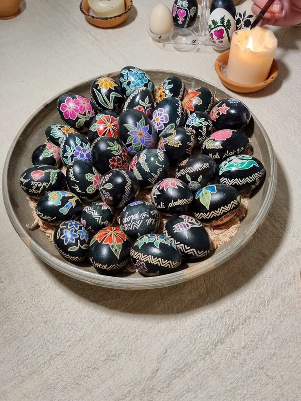 Črne pisanice izrađuju se batik tehnikom, odnosno nanošenjem voska, s tipičnim cvjetnim motivima.