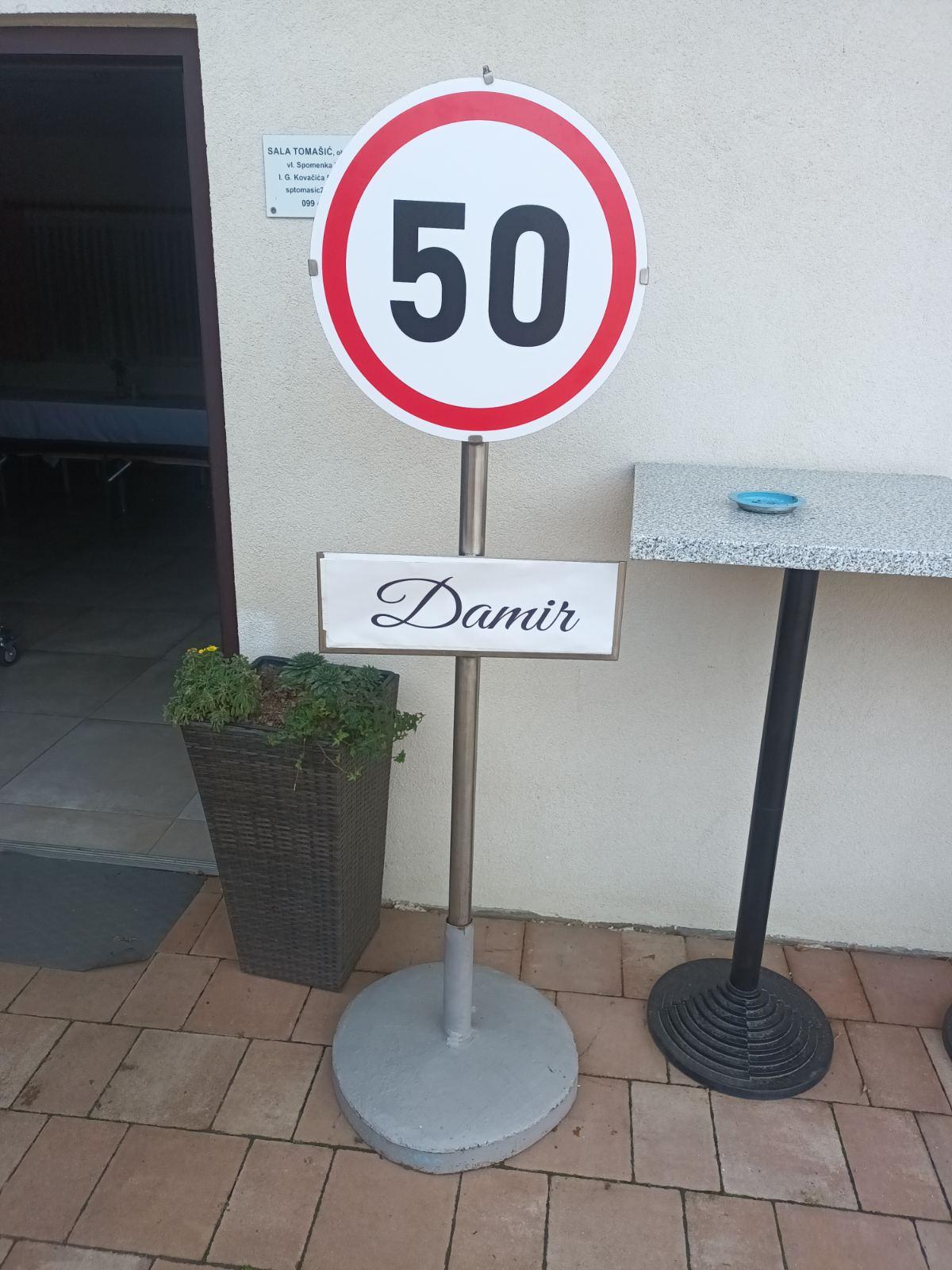 U petak navečer ispred sale za svečanosti OPG-a Tomašić u Lopatincu dočekao je goste neobičan prometni znak — ograničenje brzine do 50, a ispod brojke jednostavno je pisalo DAMIR. Simbolično i duhovito, upravo je u znaku te brojke protekla cijela večer.