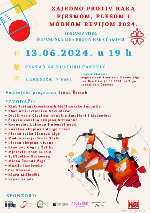 Već se broje sati do današnje tradicionalne humanitarne priredbe “Zajedno protiv raka pjesmom, plesom i modnom revijom”. Priredbu organizira Županijska liga protiv raka Čakovec danas u 19 sati u Centru za kulturu Čakovec. Uz goste izvođače na priredbe, obol će joj dati i sami članovi kluba.