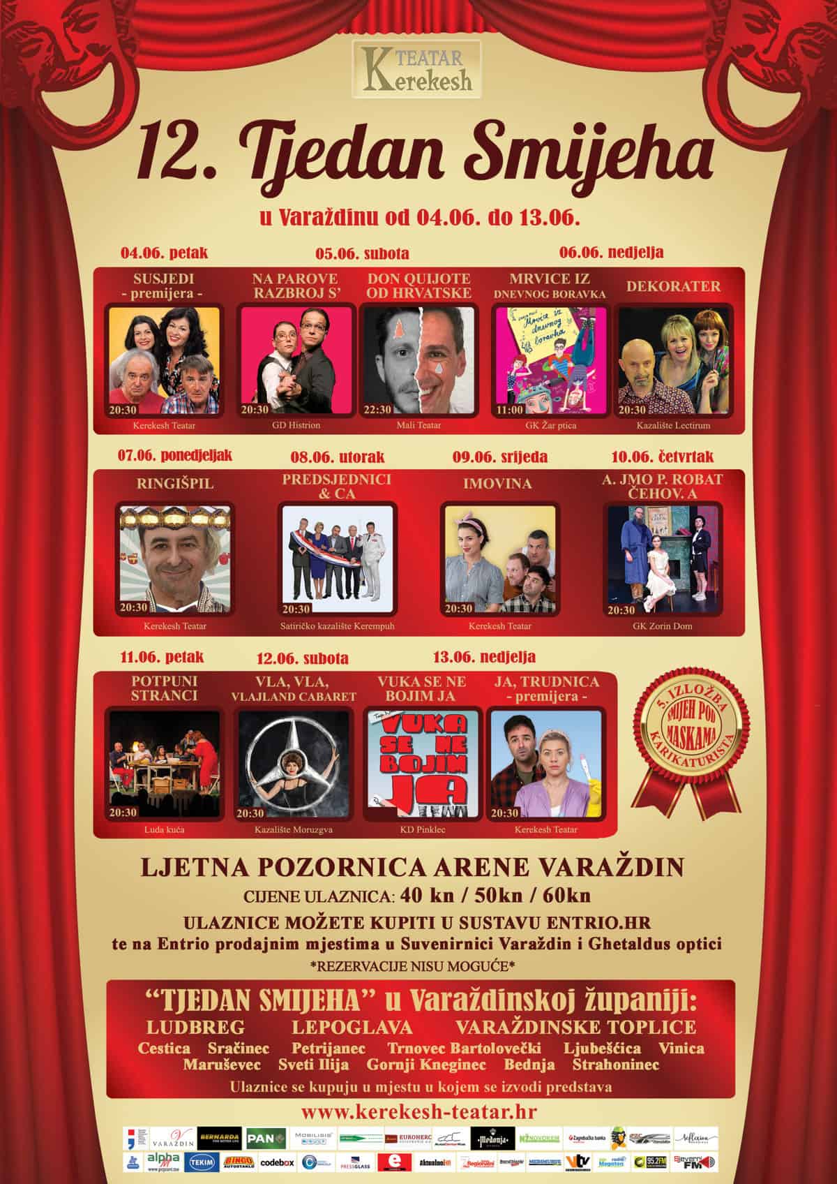 12. Tjedan smijeha održat će se na ljetnoj pozornici Arene Varaždin. Otvorenje festivala započinje premijerom predstave „SUSJEDI“, najiščekivanije predstave ove godine koja je napravljena prema najgledanijoj seriji u režiji Ljubomira Kerekeša, dok će točku na „i“ staviti premijera predstave „JA, TRUDNICA“ u režiji Jana Kerekeša.