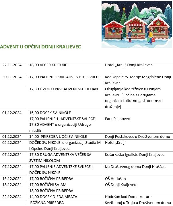 U subotu, 7. prosinca, u 17 sati održat će se paljenje adventske svijeće i doček Sv. Nikole iza Društvenog doma u Donjem Hrašćanu, a u 17.30 sati Druga adventska večer sa Sv. Nikolom na Košarkaškom igralištu Donji Kraljevec.