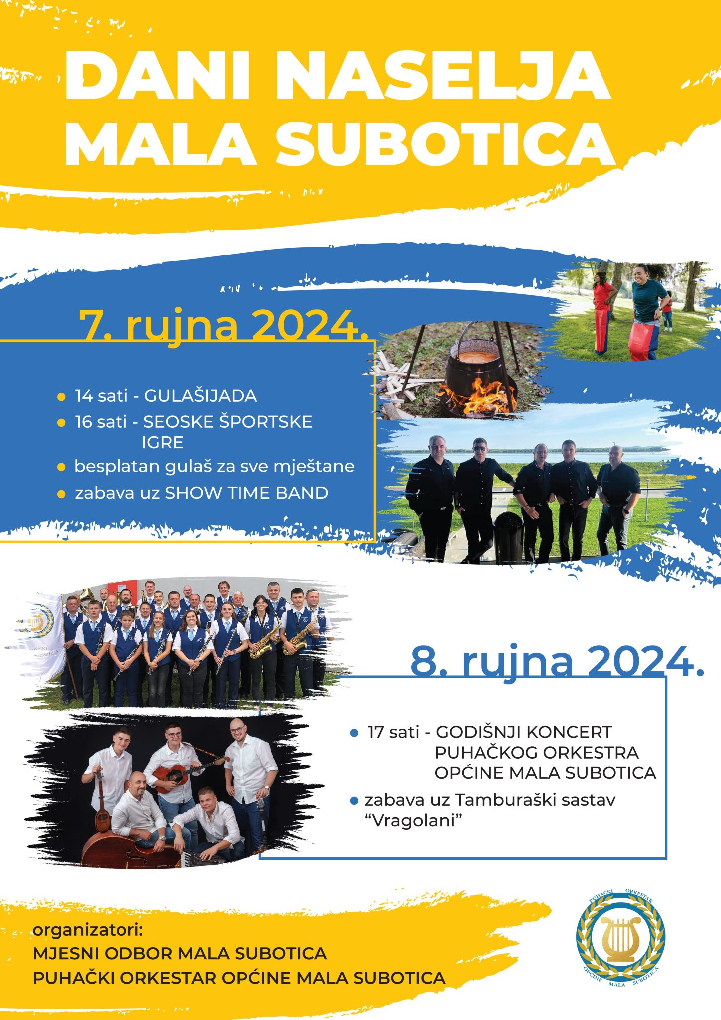 U nedjelju, 08. rujna s početkom u 17:00 sati Puhački orkestar Općine Mala Subotica održati će svoj tradicionalni godišnji koncert, dok nas nakon koncerta očekuje zabava uz Tamburaški sastav “Vragolani”.