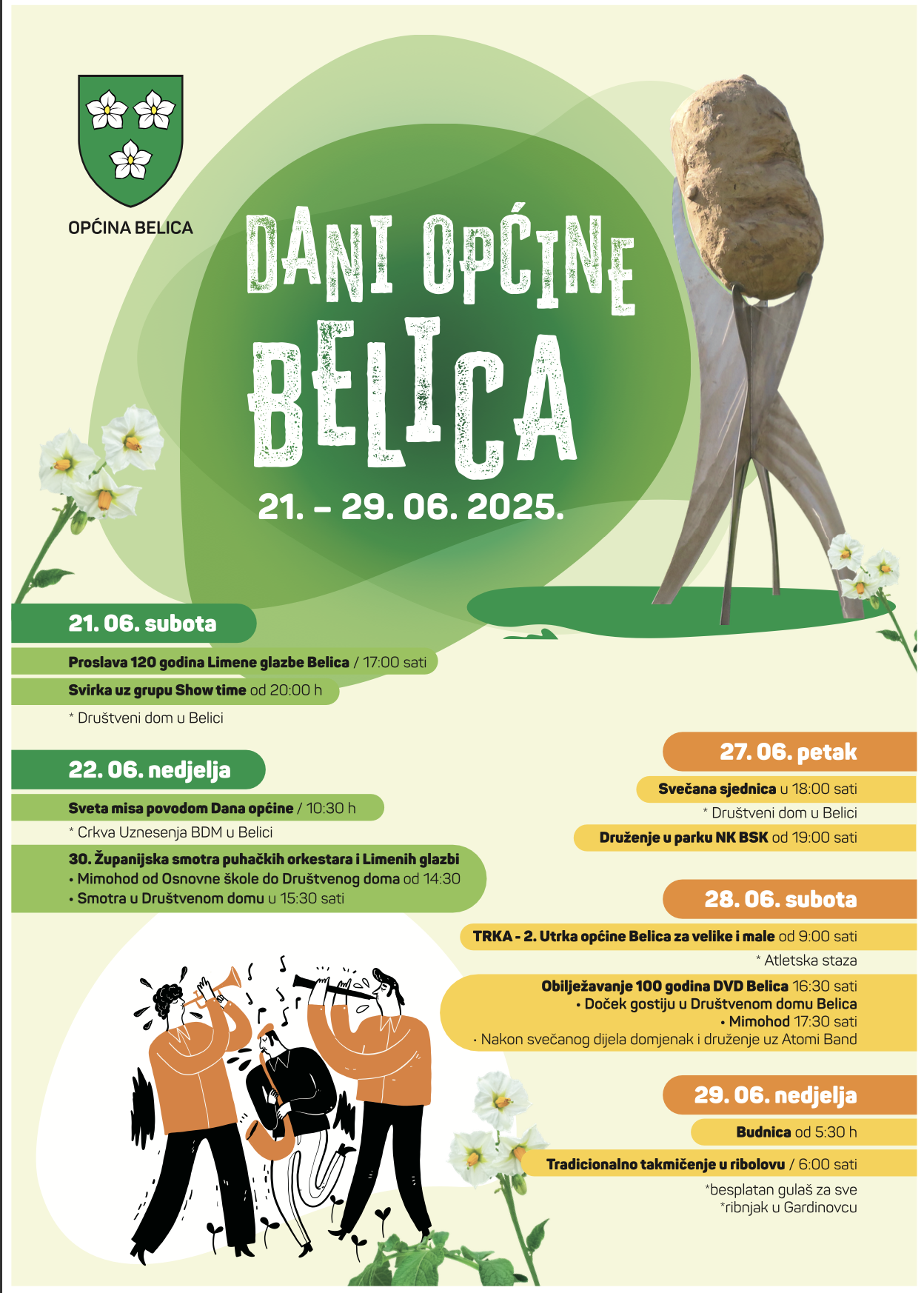 Program započinje u subotu, 21. lipnja, proslavom 120 godina Limene glazbe Belica u 17 sati, a večer će zaključiti koncert grupe Show Time s početkom u 20 sati, u Društvenom domu u Belici.