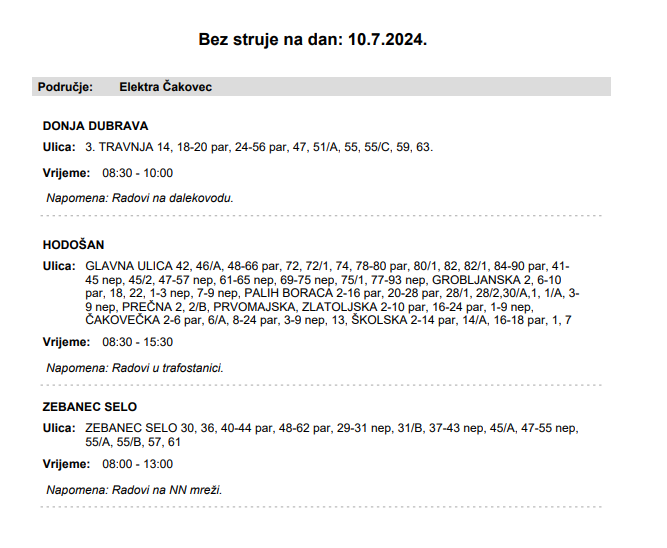 U srijedu, 10. srpnja 2024., dijelovi Donje Dubrave, Hodošana i Zebanec Sela neće imati struje.