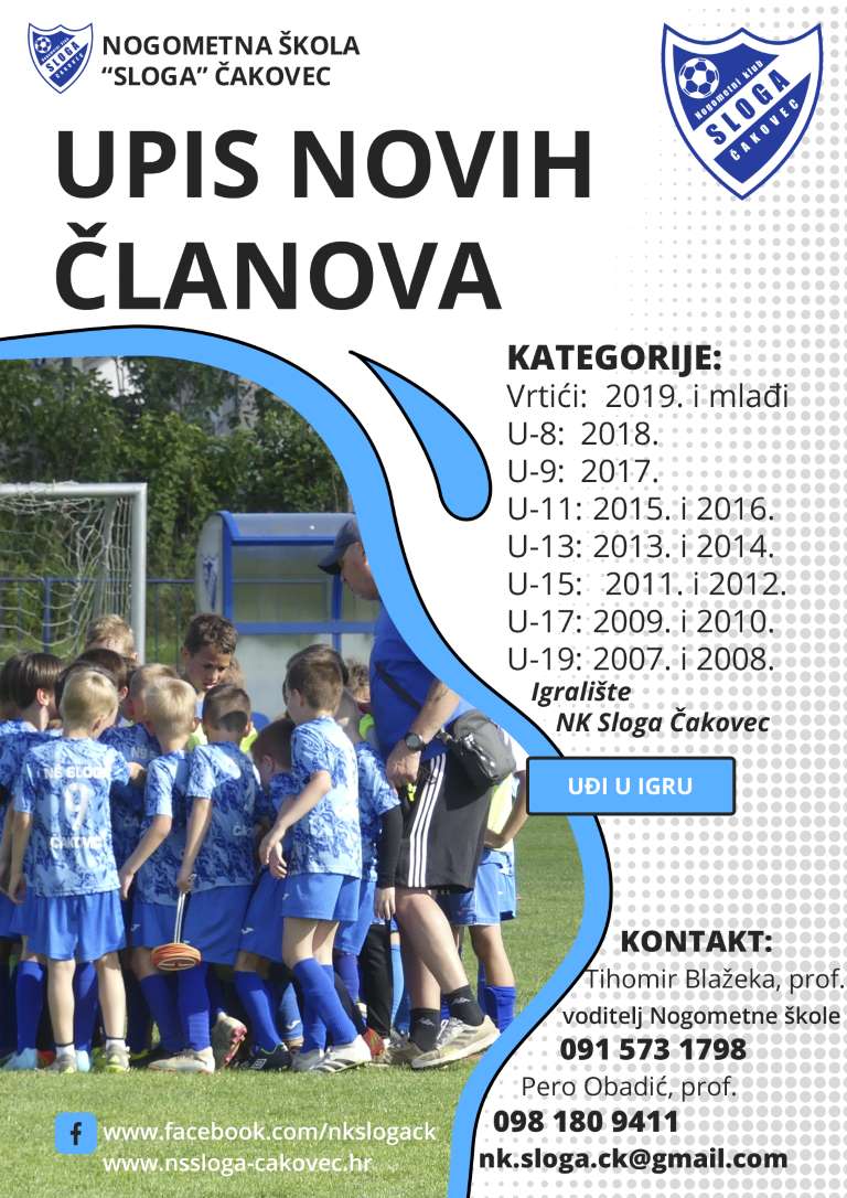 – Upisi su otvoreni tijekom cijele godine, a treninge održavamo bez ljetnih pauza – jer ljubav prema nogometu ne staje! Svako dijete može se priključiti u bilo kojem trenutku, jednostavno dolaskom na jedan od naših redovnih treninga na igralištu NK Sloga Čakovec (Ulica Mihovila Pavleka Miškine 2) – poručuju iz Kluba.