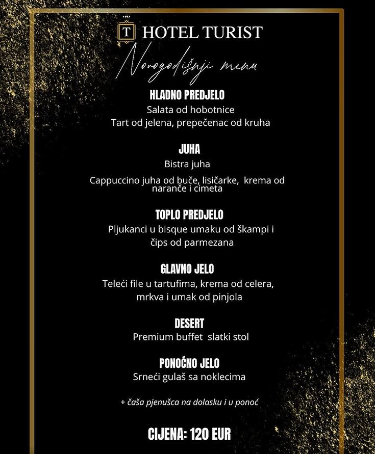 Gostima se nudi gala večera, živa glazba u izvedbi ExZodiac banda, čaša pjenušca u ponoć, kao i prilika za osvajanje nagrada u tomboli. Doček će se održati u elegantnim dvoranama Bella i Aira, uz vrhunsku uslugu i atmosferu po kojoj je Hotel Turist već godinama poznat.