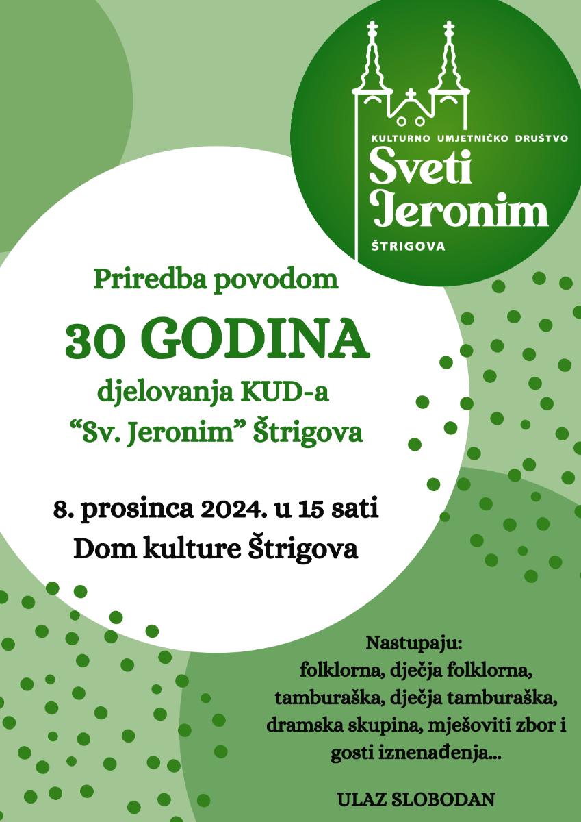 Pozivaju vas da se pridružite na svečanoj priredbi povodom 30 godina djelovanja KUD-a „Sv. Jeronim“ Štrigova koja će se održati u nedjelju, 8. prosinca 2024. godine, s početkom u 15 sati u Domu kulture u Štrigovi.