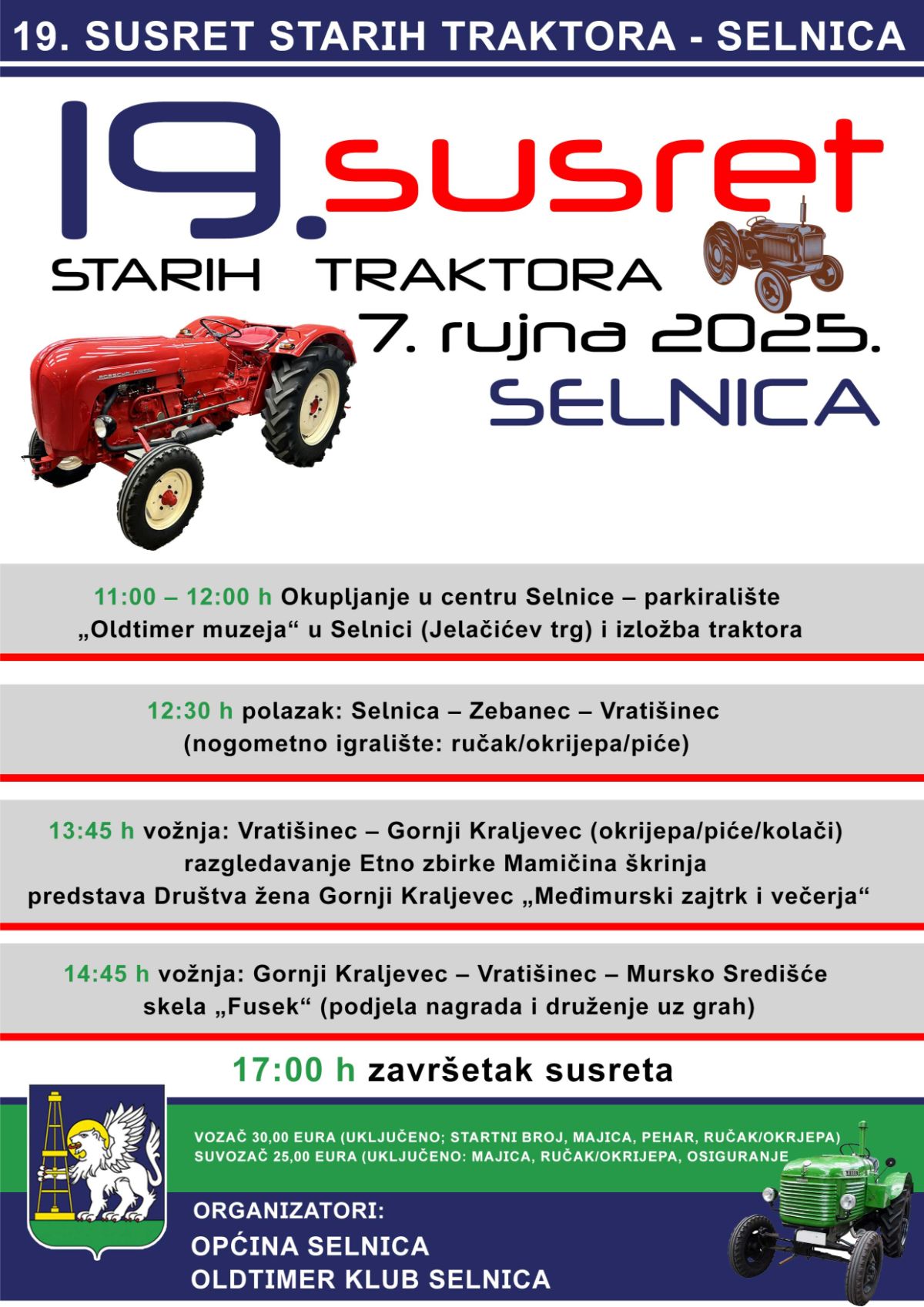 Općina Selnica i Oldtimer klub Selnica pozivaju sve zaljubljenike u tradiciju i stare strojeve na 19. Susret starih traktora, koji će se održati u nedjelju, 7. rujna 2025. godine.