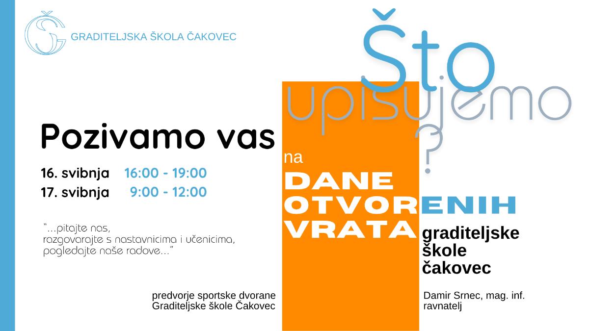 Ekonomska i trgovačka škola Čakovec (ETŠ) te Građiteljska škola Čakovec (GŠČ) pozivaju sve osmaše i njihove roditelje na Dane otvorenih vrata. Posjetitelji će imati priliku upoznati se s nastavnim programima, zanimanjima koja škole nude, te razgovarati s učenicima i profesorima.