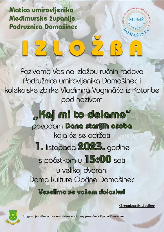 Povodom Dana starijih osoba, u nedjelju, 1. listopada 2023. godine od 15 sati u velikoj dvorani Doma kulture u Domašincu, održat će se izložba ručnih radova Matice umirovljenika Međimurske županije – Podružnice Domašinec i kolekcijske zbirke Vladimira Vugrinčića iz Kotoribe pod nazivom „Kaj mi to delamo“.