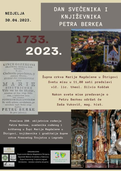 U župi sv. Marije Magdalene u Štrigovi, 30. travnja 2023. obilježit će se 290. obljetnica rođenja hrvatskoga svećenika i književnika Petra Berkea (Globoka 1733. – Legrad 1798.).