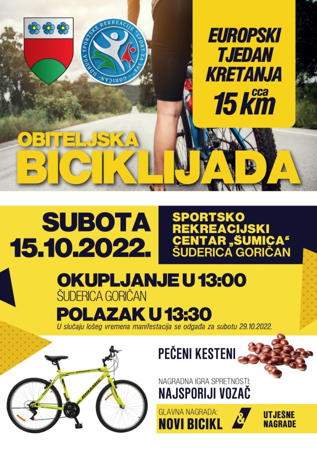 Općina Goričan i Udruga sportske rekreacije „Sport za sve“ iz Goričana, povodom Europskog tjedna kretanja, pozivaju sve zainteresirane na veliku Obiteljsku biciklijadu u Sportsko-rekreacijski centar „Šumica“ na Šuderici u Goričanu u subotu, 15. listopada 2022. godine. Okupljanje je u 13 sati na Šuderici, a polazak u 13.30 sati.