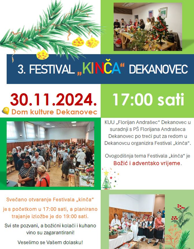 U subotu, 30. studenoga 2024. godine, s početkom u 17 sati, kada je zakazano svečano otvorenje, u Domu kulture u Dekanovcu održat će se 3. Festival kinča u organizaciji KUU „Florijan Andrašec“ Dekanovec.