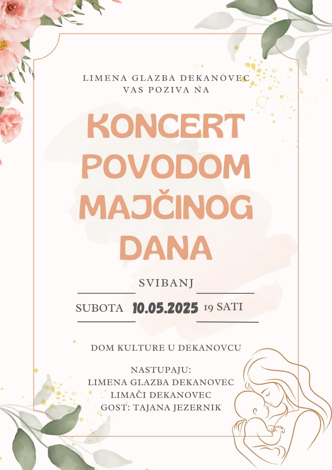 U povodu Majčinog dana, Limena glazba Dekanovec organizira cjelovečernji koncert, i to u subotu, 10. svibnja, s početkom u 19 sati. Koncert će se održati u Domu kulture u Dekanovcu, a uz Limenu glazbu Dekanovec, nastupaju Limači Dekanovec te poznata pjevačica Tajana Jezernik.