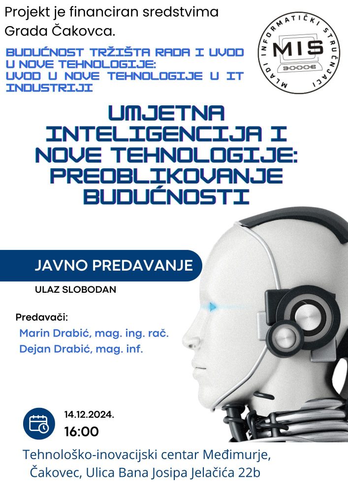 Udruga Mladi informatički stručnjaci (MIS) u suradnji s udrugom Međimurski informatički klub (MIK) organizira javno predavanje “Umjetna inteligencija i nove tehnologije: preoblikovanje budućnosti”. Predavanja će se održati u sklopu projekta “Budućnost tržišta rada i uvod u nove tehnologije” i aktivnosti “Uvod u nove tehnologije u IT industriji” koji financira grad Čakovec u sklopu javnog poziva za financiranje programa i projekata namijenjenih mladima za 2024. godinu.