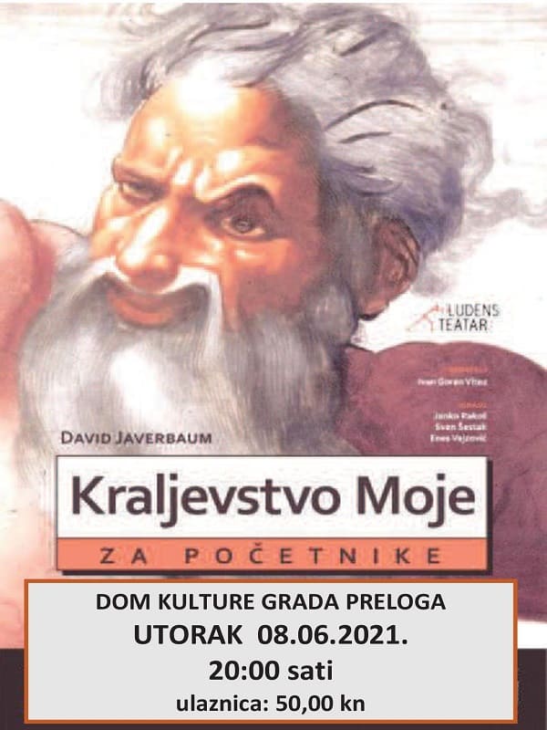 U utorak, 8. lipnja, s početkom u 20,00 sati u Domu kulture Grada Preloga, možete pogledati predstavu Kraljevstvo Moje (za početnike), u produkciji Ludens teatra i Teatra EXIT. Autor je izvornog teksta David Javerbaum, a redatelj Ivan Goran Vitez, dok su u glavnim ulogama Janko Rakoš, Sven Šestak i Enes Vejzović. Predstava Kraljevstvo Moje (za početnike) nastala je po tekstu Davida Javerbauma Čin Božji (orig: An Act of God) koji je praizveden na Broadwayu 2015. godine.