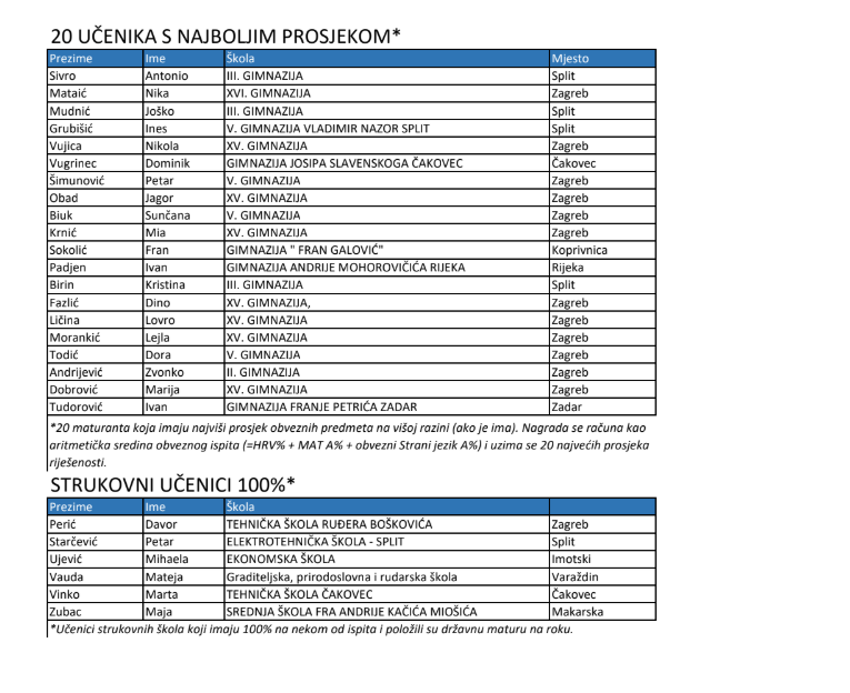 Među učenicima koje je nagradilo Ministarstvo obrazovanja nalazi se i Vugrinec Dominik iz Gimnazije Josipa Slavenskog Čakovec. A među učenicima iz strukovnih škola koji su 100 posto riješili neki ispit je i Vinko Marta iz Tehničke škole Čakovec.