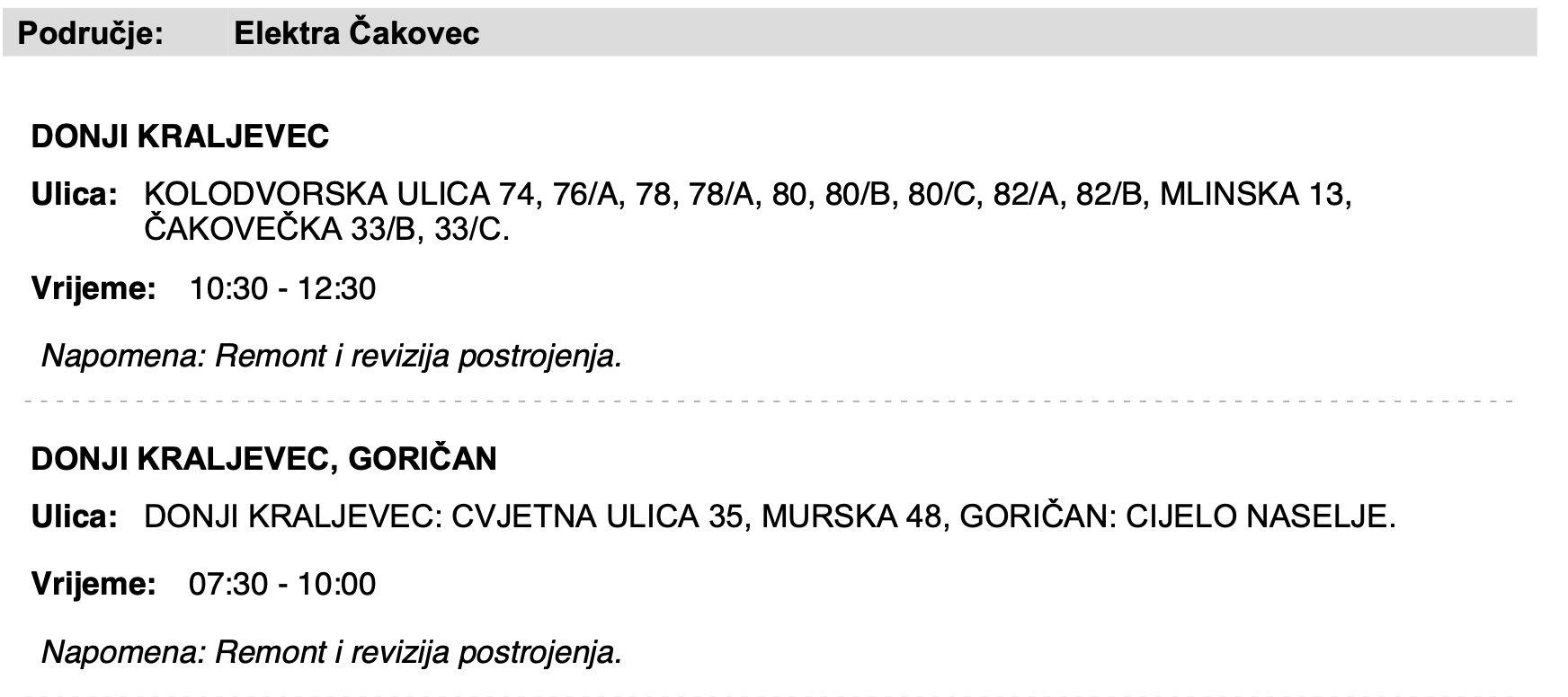 Iz čakovečkog HEP-a stigla je informacija kako u nedjelju, 25. svibnja, zbog radova, neće biti struje u sljedećim mjestima:
