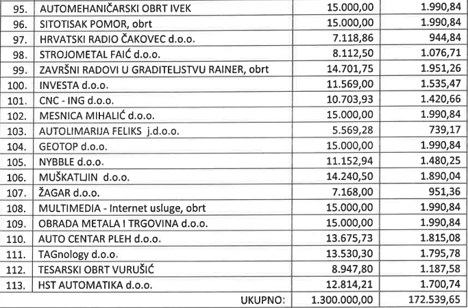 Nakon provedenog javnog poziva za dodjelu bespovratnih potpora poduzetnicima ukupno je 113 poduzetnika (od 184 prijavljenih) s područja Međimurske županije ostvarilo pravo na županijske potpore u maksimalnom iznosu do 15 tisuća kuna ili ukupno 1,3 milijuna kuna.