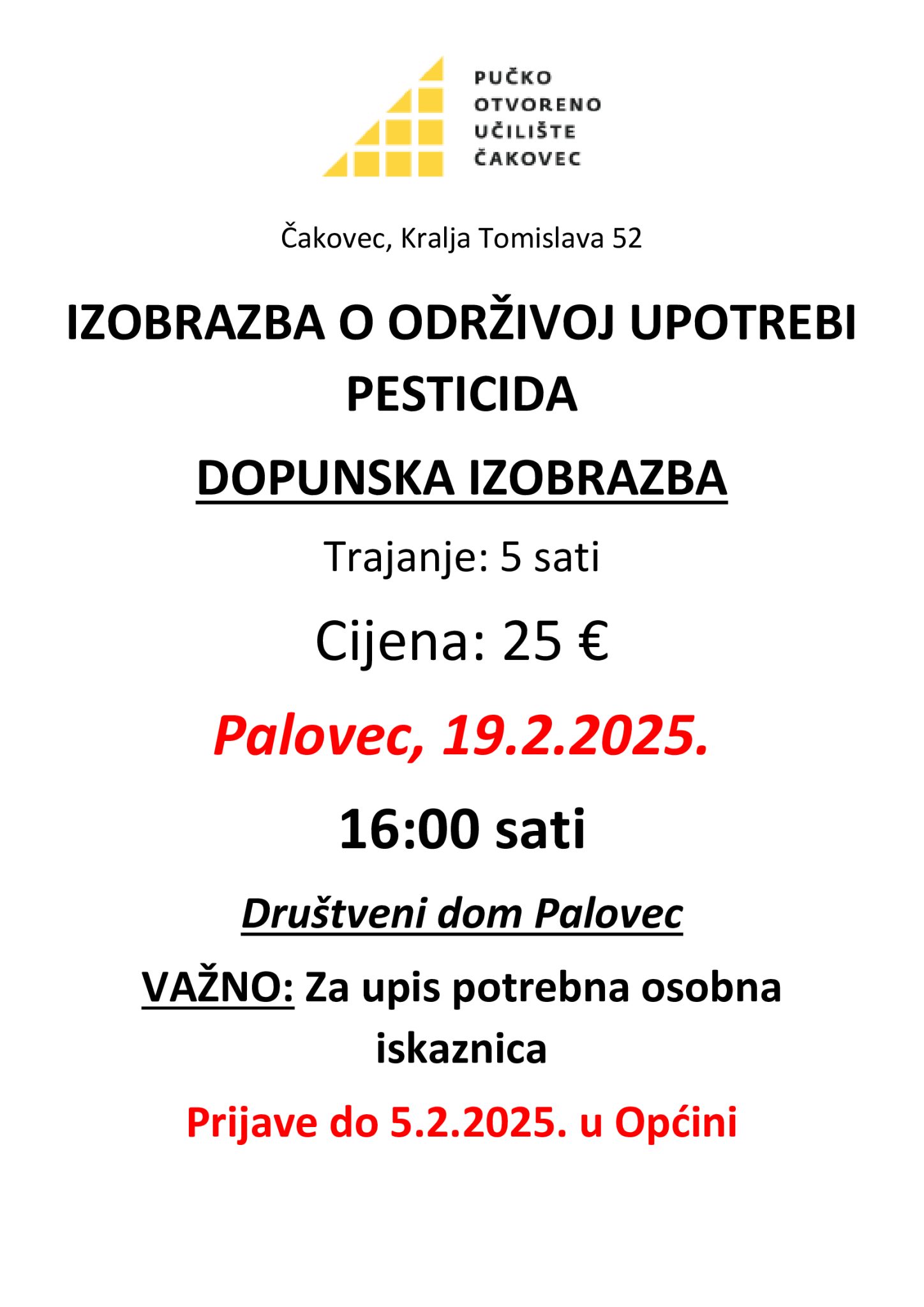 Pučko otvoreno učilište Čakovec u suradnji s Općinom Mala Subotica, organizira dopunsku izobrazbu o održivoj upotrebi pesticida. Izobrazbu će održati u Društvenom domu Palovec, i to u srijedu 12.02. i 19.02.2025. godine s početkom u 16:00 sati.