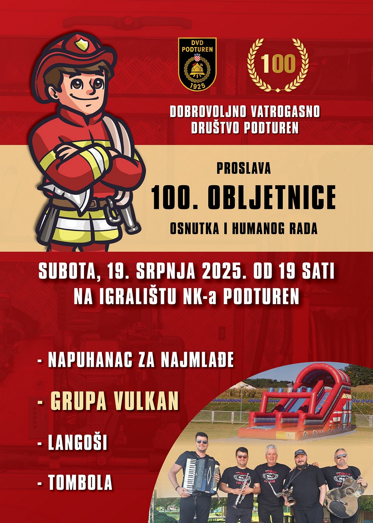 Dobrovoljno vatrogasno društvo Podturen proslavit će svoj veliki jubilej – 100. obljetnicu osnutka i humanog rada – u subotu, 19. srpnja 2025. godine, na igralištu NK-a Podturen.