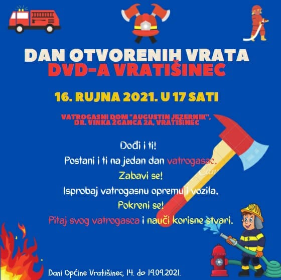 Dobrovoljno vatrogasno društvo Vratišinec poziva sve, velike i malene, na Dan otvorenih vrata DVD-a Vratišinec koji će se održati u četvrtak, 16. rujna, s početkom u 17 sati, ispred vatrogasnog doma u Vratišincu. Dan otvorenih vrata obilježava se u sklopu proslave Dana Općine Vratišinec.