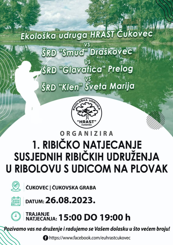 Ekološka udruga „Hrast“ iz Čukovca, poziva na 1. ribičko natjecanje susjednih ribičkih udruženja u ribolovu s udicom na plovak. Natjecanje će se održati u Čukovcu, na prostoru „Čukovska graba“, u subotu 26. kolovoza, od 15 do 19 sati.