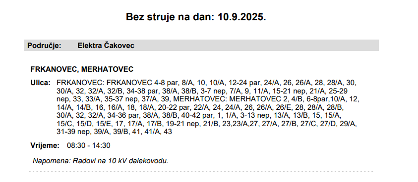 Iz HEP-a javljaju da električne energije 10. rujna neće biti u Frkanovcu i Merhatovcu.
