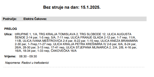 Iz HEP-a javljaju da 15. siječnja električne energije neće biti u nekoliko ulica u Prelogu: