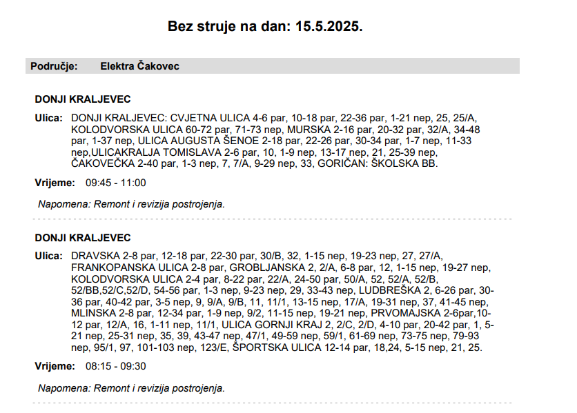 Iz Elektre Čakovec javljaju da 15. svibnja električne energije neće biti u Donjem Kraljevcu: