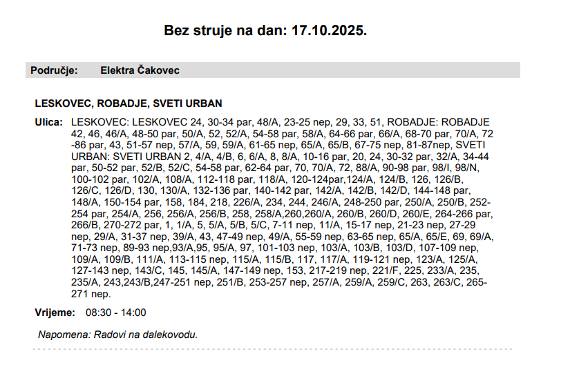 Iz HEP-a javljaju da električne energije 17. listopada neće biti u Leskovcu, Robadju i Svetom Urbanu.