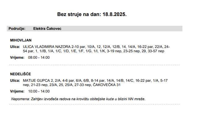 Iz HEP-a javljaju da električne energije 18. kolovoza neće biti u Mihovljanu i Nedelišću, zbog zahtjeva radova na krovištu obiteljske kuće u blizini NN mreže.