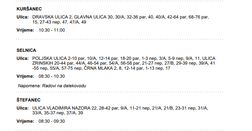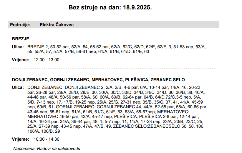 Električne energije 18. rujna neće biti u Brezju, Donjem Zebancu, Gornjem Zebancu, Merhatovcu, Plešivici, Zebanec Selu, Kuršancu, Selnici i Štefancu.