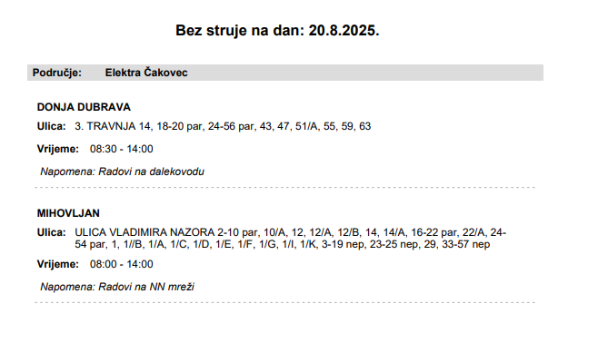 Iz HEP-a javljaju da električne energije 20. kolovoza neće biti u Mihovljanu i Donjoj Dubravi, zbog radova na NN mreži.