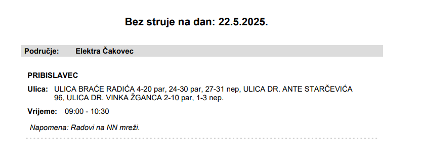 Iz Elektre Čakovec javljaju da 22. svibnja električne energije neće biti u Pribislavcu.